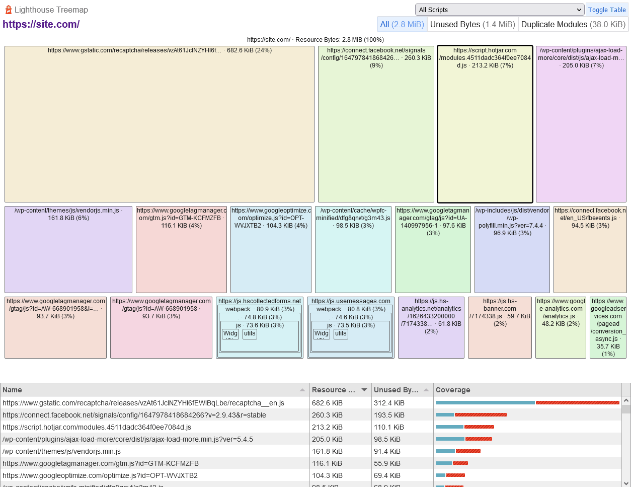 例如,一个树状图显示了最大的JavaScript资源,其中包含一个覆盖率指标,该指标指示使用和未使用代码的比例: