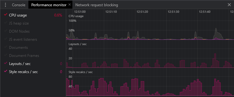 基于Chromium的浏览器具有实时性能监视器。同样,这可以从DevTools的“更多工具”菜单中获得。当您浏览页面、滚动和触发动画时,图表会更新: