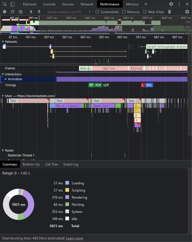 - 顶部红色条:这表示帧速率显著下降,这可能会导致性能问题。这在页面加载开始时是应该的,但是过多的CSS动画也可能是一个问题。