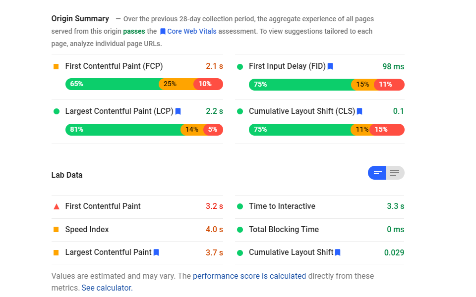与大多数网站性能指标一样,最常用的工具之一是Google自己的PageSpeed Insights。这个工具也是它返回的结果中最特别的工具之一。即使是最完善的站点,它也相对挑剔。PageSpeed Insights最常根据过去28天收集的汇总数据为您的网站提供实验室数据。但是,如果您有足够多的访问者通过Chrome将信息转发回Google,您也可以从报告中获取真实的实测数据。不过,并不是每个网站都能得到这个。