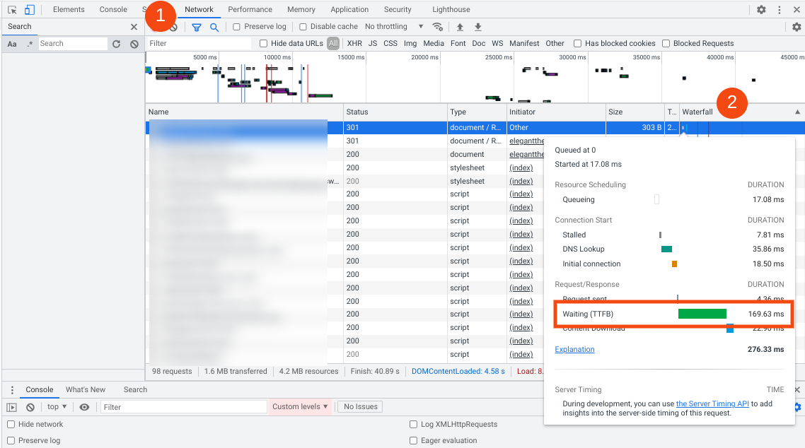 在列表中,选择要检查的项目。在面板下,您可以找到等待(TTFB)。