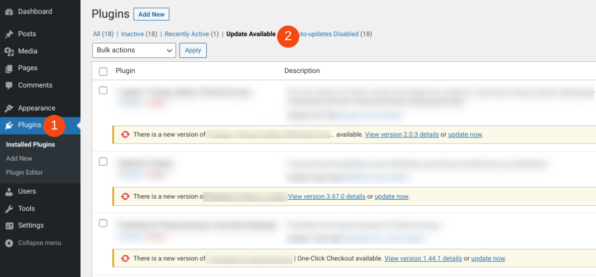 在您的WordPress管理仪表板中,您可以通过导航到插件找到可用的插件更新,然后单击可用更新链接: