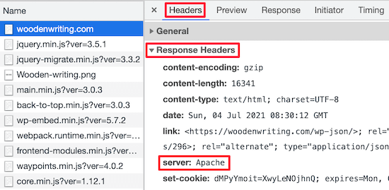 然后,在“Response Headers(响应标头)”部分,您将看到一个名为“server(服务器)”的项目,其中显示了服务器的类型。在这种情况下,该站点在 Apache 服务器上运行。