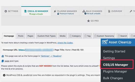 之后,您需要访问Asset CleanUp»CSS/JS Manager页面。从这里,您可以逐页卸载不需要的CSS和JavaScript文件。