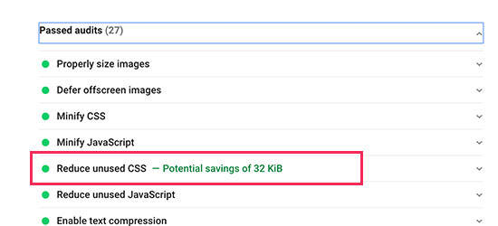 您可以使用Google Pagespeed Insights了解未使用的CSS代码如何影响您的网站。标题为“Remove unused CSS”的部分,将详细说明了哪些CSS文件影响网站加载时间。