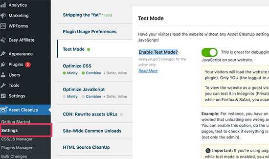 启用后,您需要访问Asset CleanUp»Settings页面并切换到Test Mode选项卡。从这里,您需要打开“Enable Test Mode”选项。