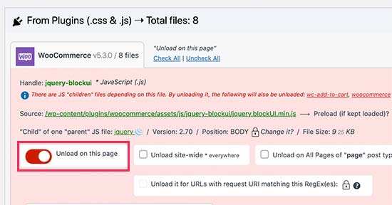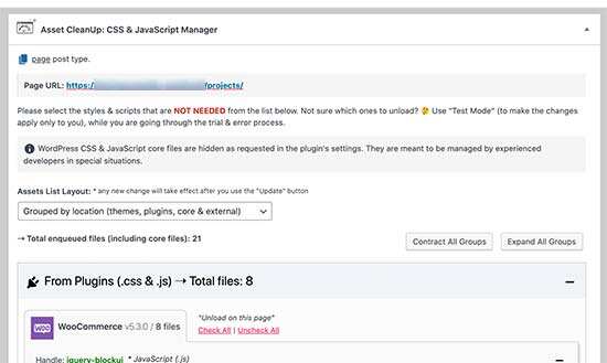 当访问者在您的网站上查看此页面时,该插件将自动获取并列出加载的所有文件和资源。然后,您可以简单地卸载该页面上不需要的未使用的CSS或JavaScript文件。