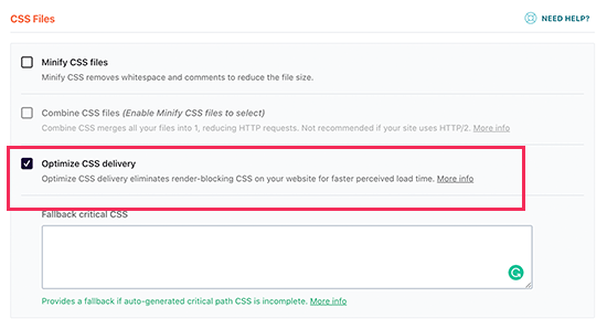接下来,您需要向下滚动到CSS文件部分,选中“Optimize CSS delivery”选项旁边的框。