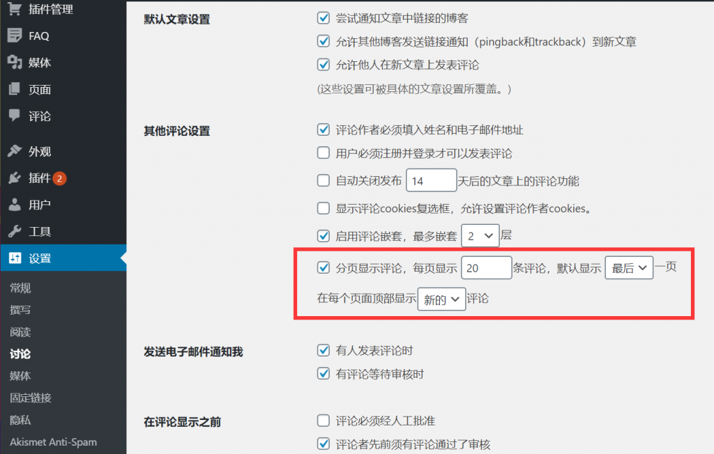 首先登陆WordPress后台,在仪表盘进入“设置”»“讨论”页面。勾选“分页显示评论”选项,及输入每页显示评论数以及显示方式。如下图所示: