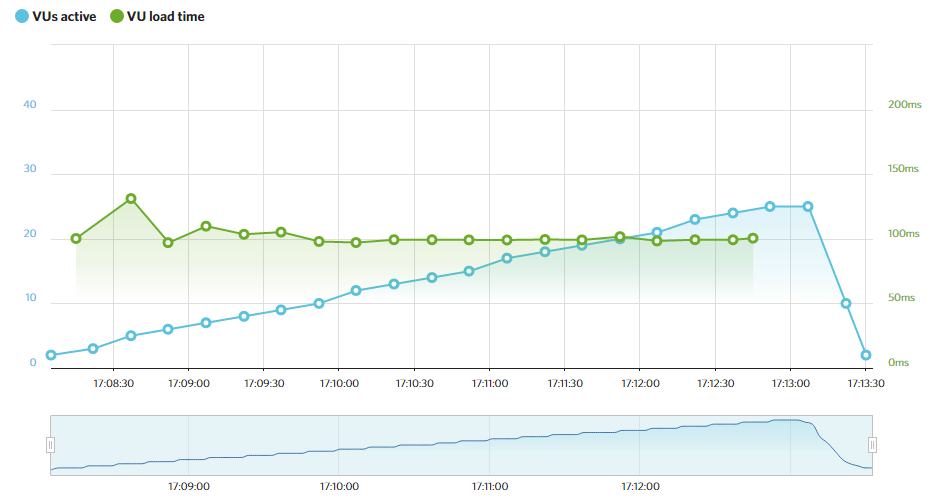 Load Impact的作用是它实际创建了25个并发(bot)用户,并将它们发送到您的站点以查看站点在负载下的执行情况。 测试持续五分钟。