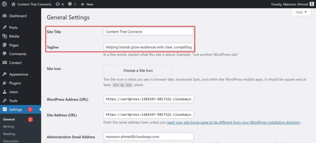 首先更新网站标题和标语。进入仪表板的 “设置”→“常规”。标题是您的企业名称或者品牌名,标语是简短的描述(如 “通过清晰、引人入胜的故事帮助品牌增加受众”)。