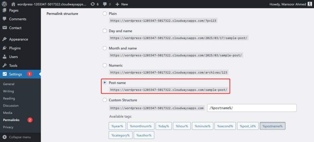 接下来,设置固定链接(网站链接的外观)。进入 “设置”→“固定链接”,选择“文章名称”。这样可以使链接简洁明了,便于搜索引擎优化(例如,www.yourbusiness.com/blog-post)。