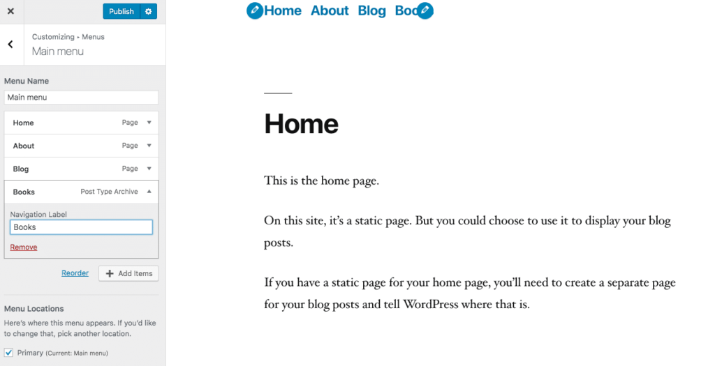 请注意,您只能通过定制器执行此操作 – 在菜单屏幕中是不可能的。因此,请确保您使用定制器将您的自定义文章类型存档添加到您的菜单中。