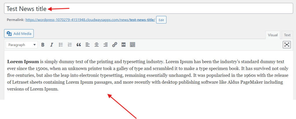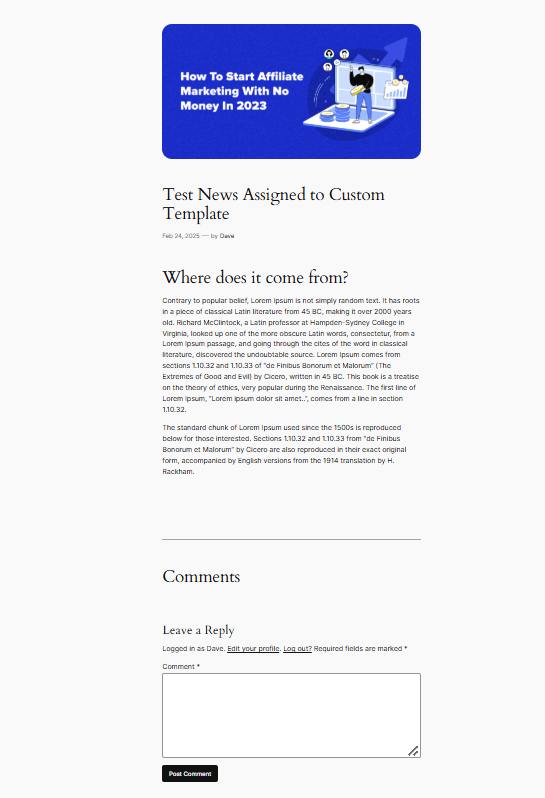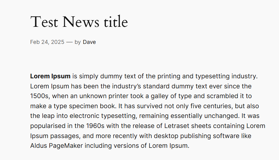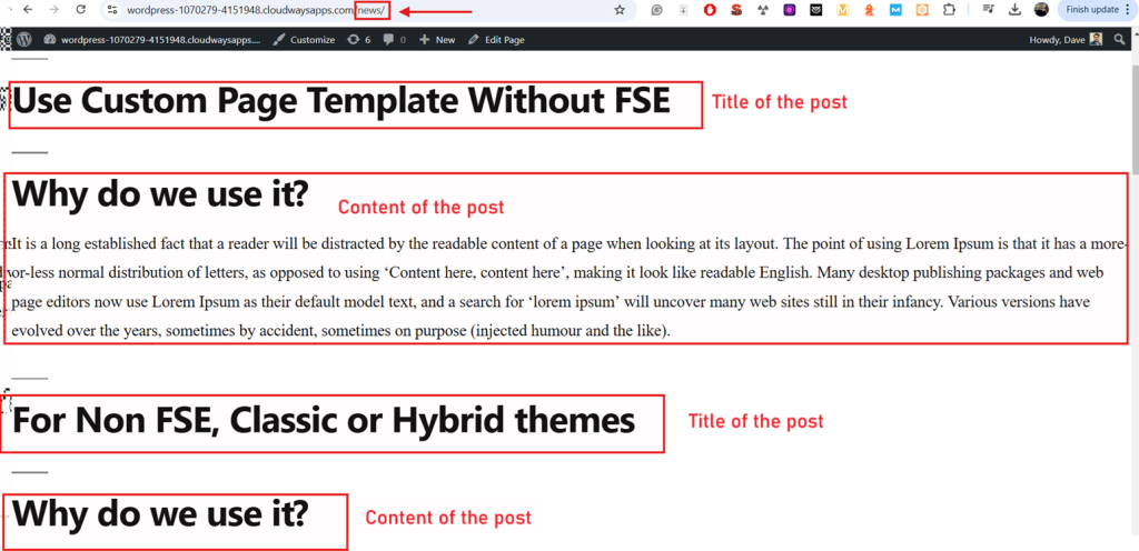 当您创建类似“新闻”这样的自定义文章类型时,WordPress 不会自动提供前端布局。如果没有模板,您的“新闻”文章就会像普通帖子一样,没有专门的布局。看看上面的截图,我们的情况正是如此。