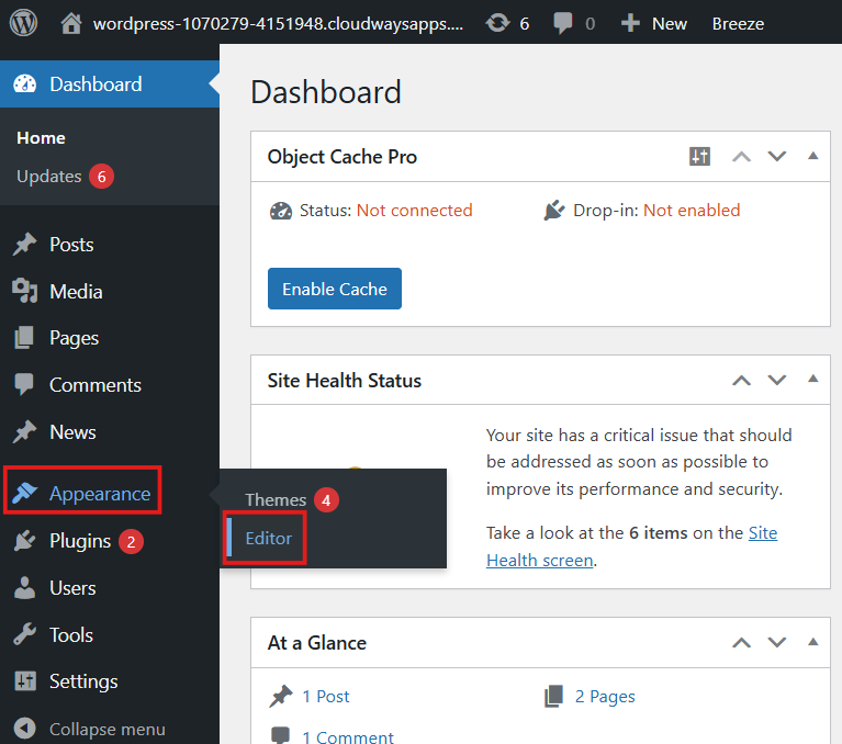 - 进入 WordPress 控制面板,导航到外观 > 编辑器 。