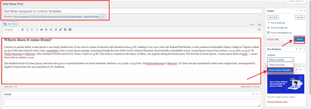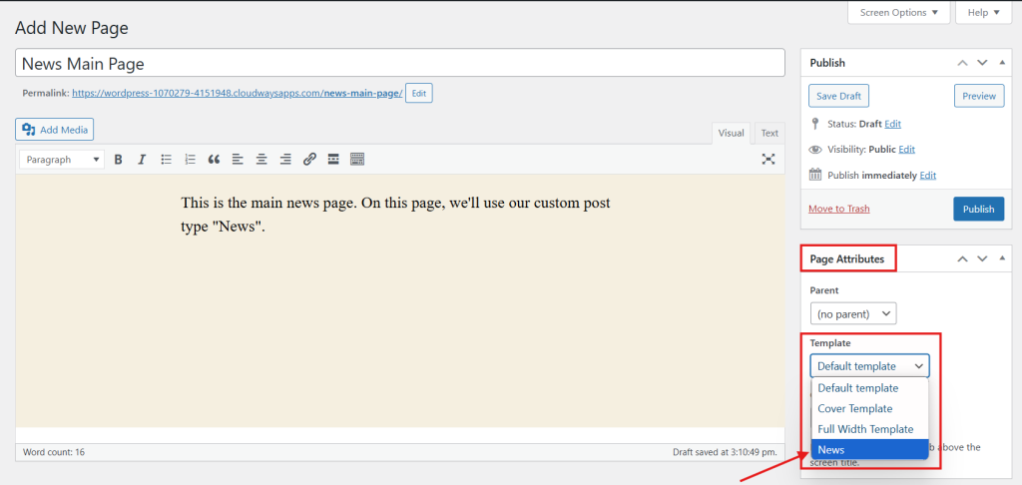 - 要将模板分配给 “新闻 ”自定义文章类型,我会创建一个新文章,然后在“文章属性”下选择我们的新模板。