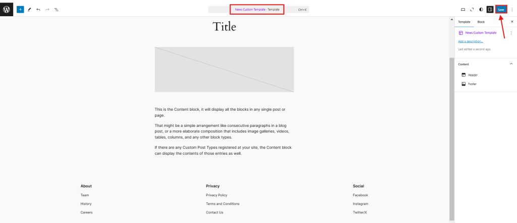 - 创建模板后,它将在编辑器中打开,您可以在其中添加区块。您可能需要添加区块来显示文章内容、标题和特色图片。