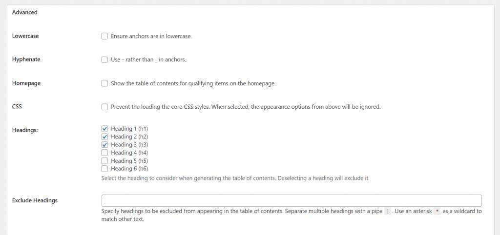- 导航到高级配置设置以定义TOC的显示条件。例如,仅选择H1、H2和H3标题将从目录中排除H4及以下标题。