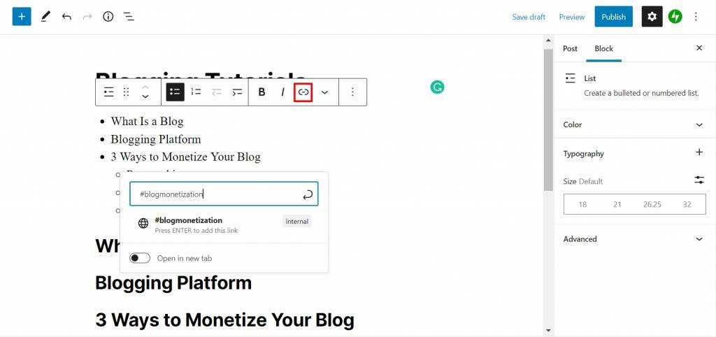 在我们的示例中,我们将向上滚动到目录中的 Headline 3,选中它,然后点击悬浮编辑面板中显示的链接图标。