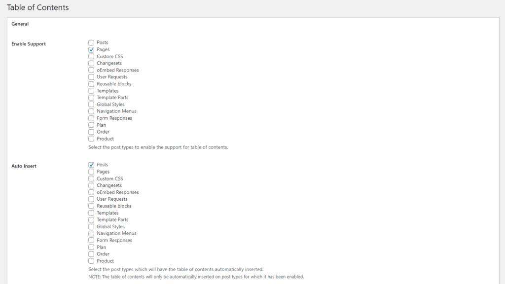 - 在General -> Auto Insert下,选择您希望插件自动添加TOC的文章类型。在这里,我们选择了Posts。