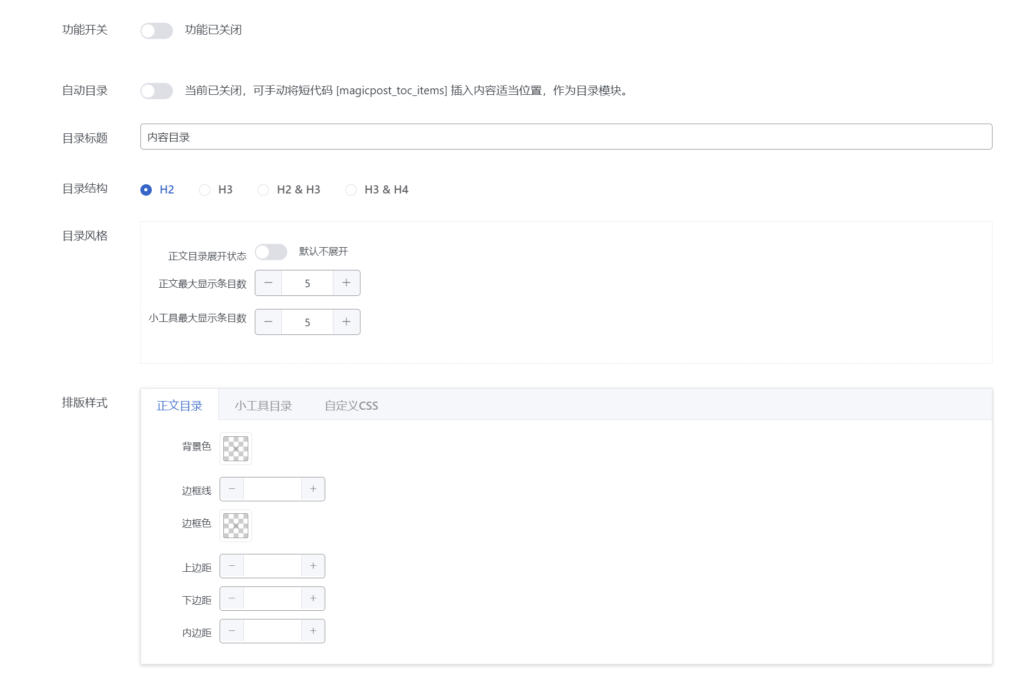 要利用Magicpost插件为文章添加TOC目录,你只需要Magicpost-内容目录,将功能开关打开,然后根据网站情况配置自动目录、目录标题、目录结构及目录风格即可。