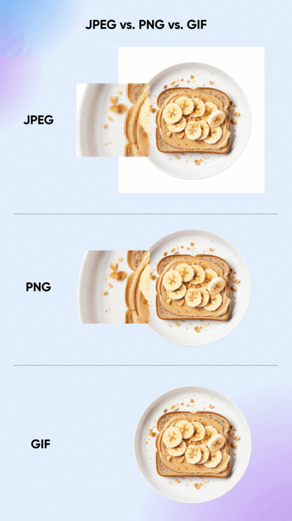 | 最佳用途 | 图形、图标和Logo | 照片 | 需透明度的图片 | 简单的动图 |