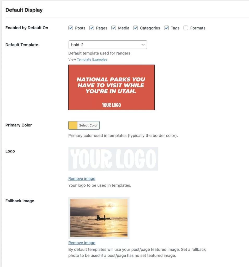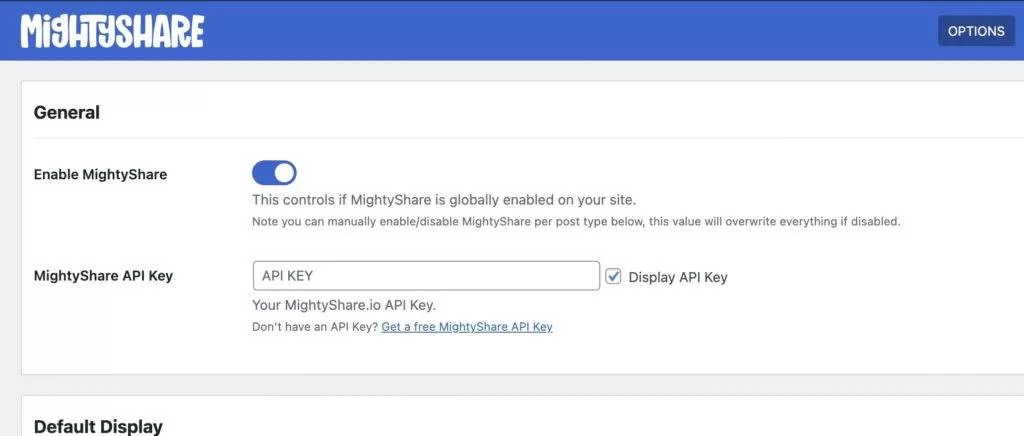 输入 API 密钥后,您可以配置 MightyShare 的默认显示选项。这包括设置默认模板、启用插件的文章类型、主色调、Logo 和备用图片。