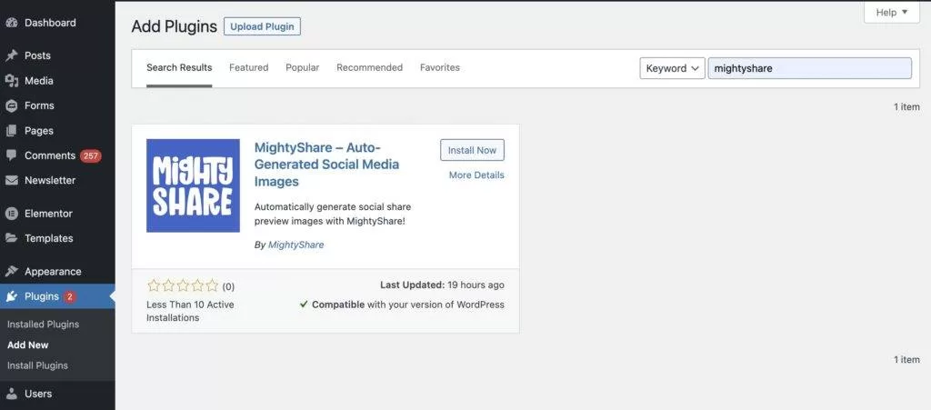 MightyShare 插件位于 WordPress.org 上,因此您可以在 WordPress 仪表板盘中进入插件>添加新插件,然后搜索 “MightyShare”,即可轻松安装。