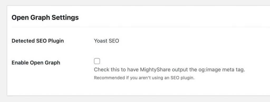 MightyShare 可与大多数流行的搜索引擎优化插件一起使用,包括 Yoast SEO 和 RankMath。该插件将覆盖搜索引擎优化插件的 og:image/twitter:image urls 输出。如果没有安装 SEO 插件,也可以勾选启用 Open Graph 框,将其手动添加到标题中。