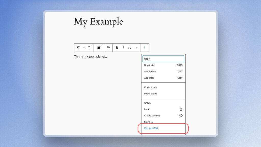 效果不佳?你可以使用内置的 HTML 编辑器。点击文本块上的三个点,然后选择 “作为HTML编辑”,就可以将要下划线的文本包含在标签中。