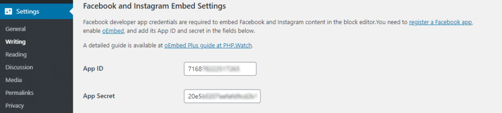 接下来,进入 WordPress 面板中的设置 → 撰写界面,搜索 Facebook and Instagram Embed Settings 部分。在此,输入您之前记下的 App ID 和 App Secret 值。