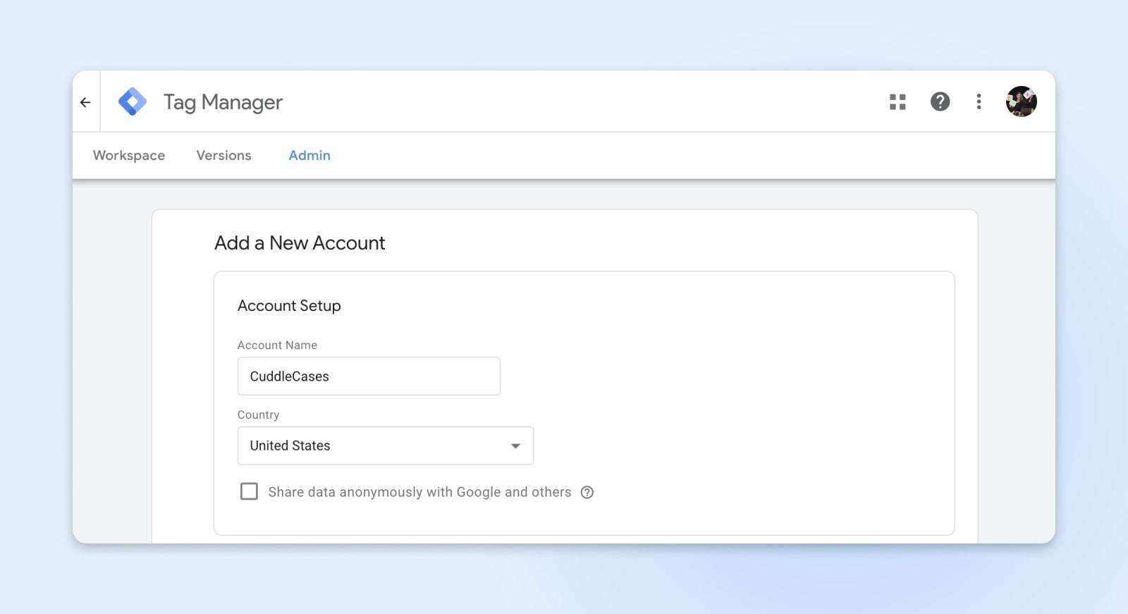- 输入账户详细信息。您需要为 GTM 账户提供一个名称。谷歌建议每个公司只拥有一个 GTM 账户,即使您拥有多个网站也是如此,因此这通常是您公司或组织的名称。在同一部分中,您需要选择您所在的国家。
