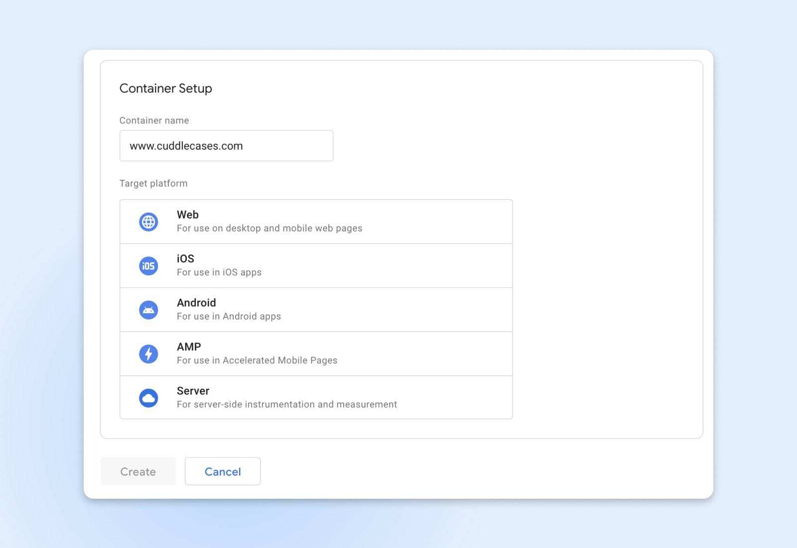 在网站上安装 GTM 之前,您需要创建一个容器来完成账户设置。容器是您添加到网站上的一段代码,用于使 Google Tag Manager 正常工作。通常情况下,您会为每个安装 GTM 的网站创建一个唯一的容器,因此当您进入账户设置流程的下一部分,输入 “Container Name” 时,通常会选择您的网站名称或 URL。