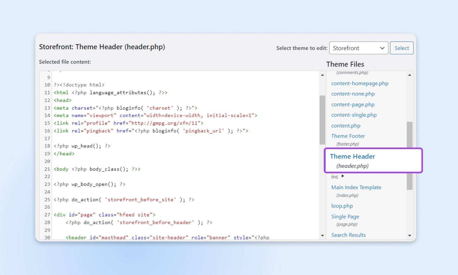 由于 WordPress 主题的设计和功能各不相同,它们的主题代码也可能不同。您要查找的是标题文件。它的通用名称是 header.php。如果找不到,请联系主题开发人员寻求帮助。