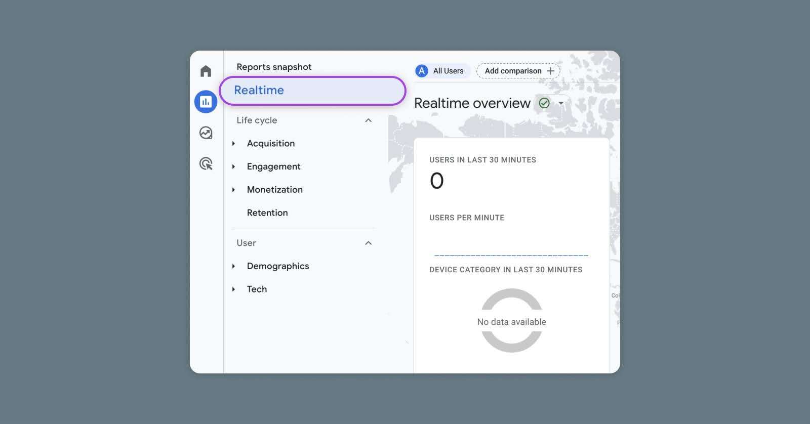 接下来,您可以在 Google Analytics 中查找实时数据。如果你在 GTM 中设置了 Google Analytics 标签,请进入你的 Google Analytics 账户并导航到实时报告。如果您在网站上看到活跃用户(您可能需要在网站上浏览以生成数据),这表明 GTM 正在向 Google Analytics 正确发送数据。
