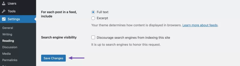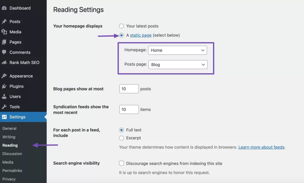 从 WordPress 面板导航到设置 → 阅读。在你的主页显示选项中,选择静态页面。然后,使用下拉菜单选择主页和文章页面。