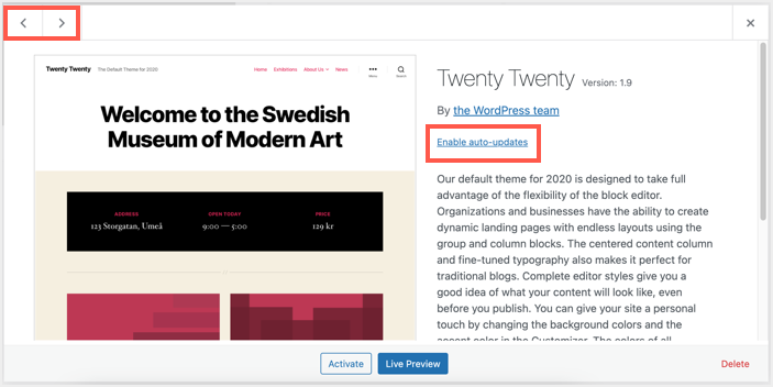 您可以为每个主题执行此操作,或使用主题详细信息弹出窗口右上角的后/前箭头导航到每个主题并打开自动更新。请记住,您可以随时转到主题详细信息部分并禁用自动更新。