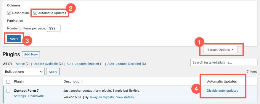 - 如果您没有看到“自动更新”列,请单击“屏幕选项”按钮并从可用列中启用。