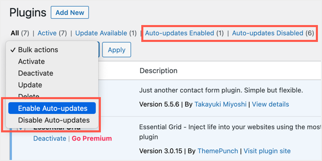 与主题不同,您可以批量启用插件自动更新或仅对选定项目启用自动更新。这是有道理的,因为单个站点通常一次使用多个插件。