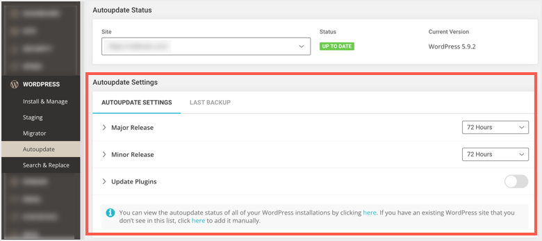 一些托管服务提供商还帮助管理WordPress中的自动更新功能。这可能因您使用的托管公司而异。例如,您可以通过导航到站点工具部分来打开SiteGround中的自动更新。该选项在“WordPress > Autoupdate”菜单下可用。您可以管理主要和次要WordPress版本的设置,并选择自动安装更新的计划。SiteGround还提供了自动更新本节中所有已安装插件的选项(我们强烈建议禁用此选项以避免出现问题)。