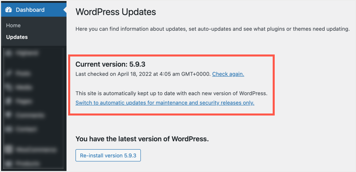 然而,禁用所有更新将阻止更新通知的出现。相反,您可以选择您的首选设置。您可以禁用插件和主题的自动更新,同时启用WordPress核心的自动更新。