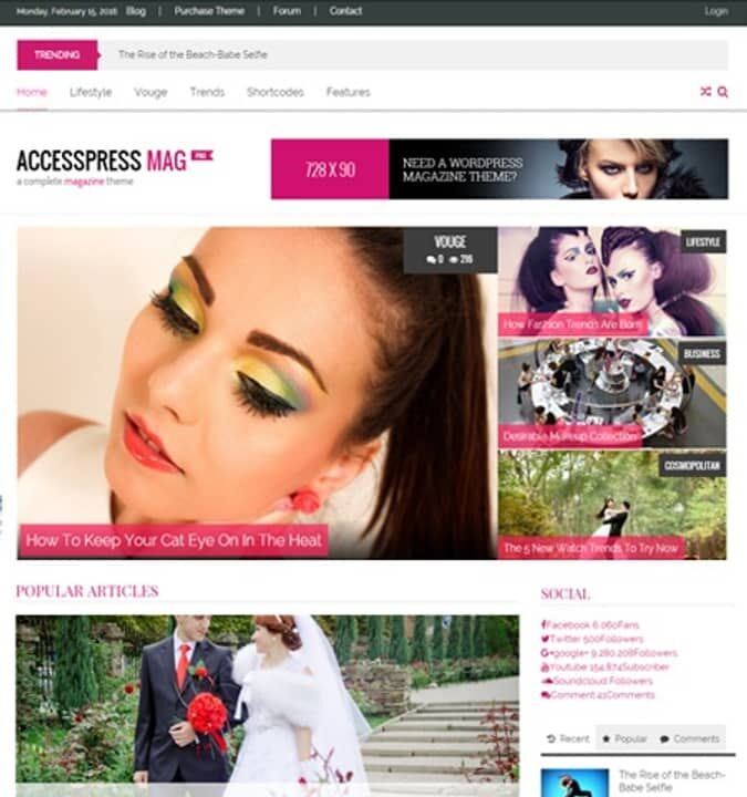AccessPress Mag Pro 这款杂志主题设计清新、现代。它提供四个不同的演示,均适用于杂志和新闻网站: 编辑、新闻、时尚和体育。时尚模板设计简洁,内容组织有序。