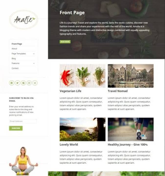 Amalie 是一款适用于 WordPress 上时尚和美食博客的精美主题。它拥有温馨的设计、直立式菜单、背景图片和组织精美的文章。它具有杂志风格的外观,能迅速引起你的注意。总的来说,这是一款简约而友好的主题。