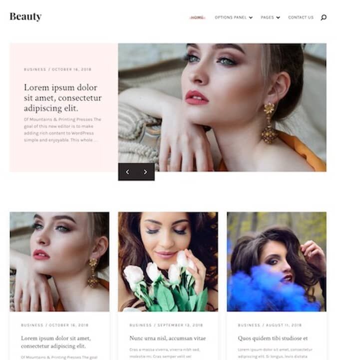 如果你的博客内容与美容有关,Beauty 是一款非常漂亮、简洁的主题。其表现形式清晰、时尚,整体上赏心悦目。还有一个漂亮的页眉面板,可以让你突出一些关键内容或产品/服务。