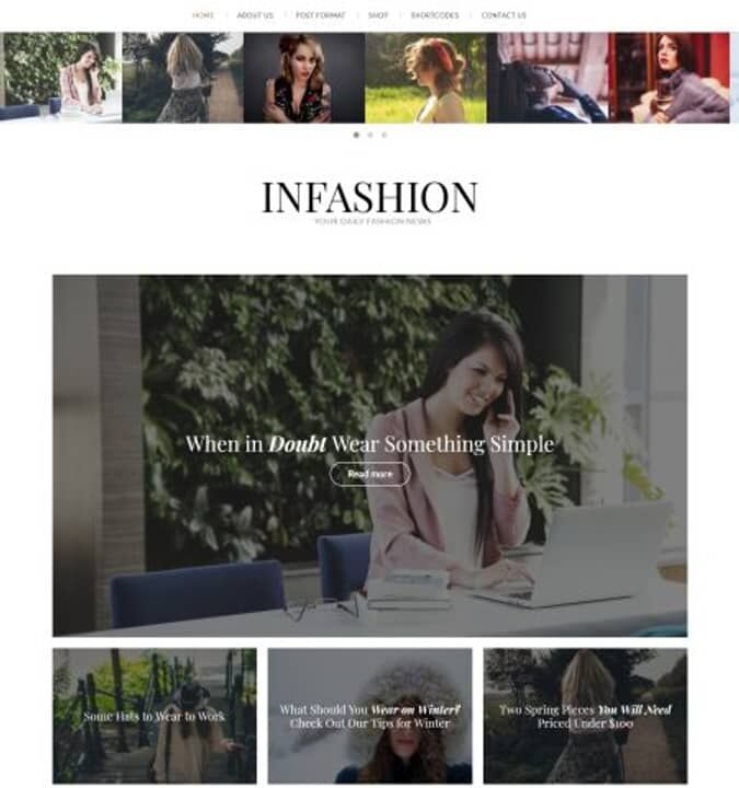 这是一款简洁、现代的主题,适合想撰写时尚类文章的人。它采用全屏整洁设计,内容结构经典。InFashion 既可用于编辑目的,也可用于与时尚相关的业务,因为它还带有一个在线商店。