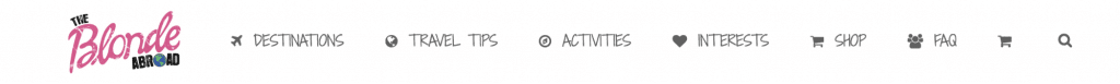 - Header:页眉位于博客顶部。您可以使用页眉以文字形式共享博客名称,或上传带有徽标的照片文件。The Blonde Abroad 在页眉中使用了自己的徽标(以及其他品牌元素):
