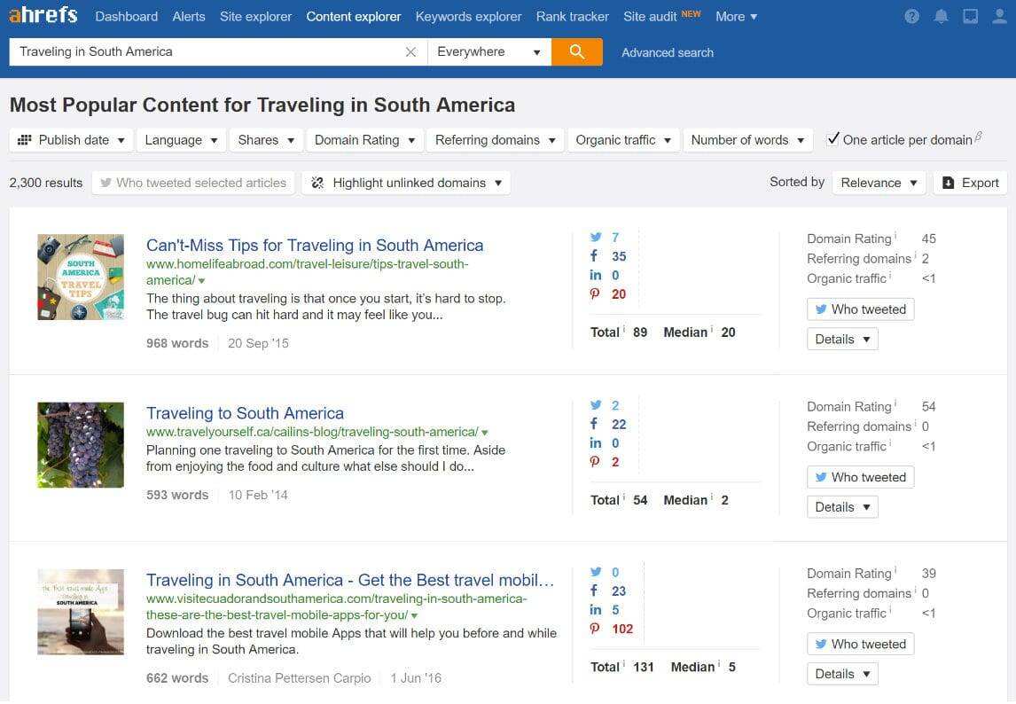 为了确保有人愿意阅读你的博客,请搜索你的竞争对手(以验证你的想法是否有现有受众)。你甚至可以利用 Ahrefs 或 BuzzSumo 等工具,查找某个细分领域最热门的内容,如 “南美旅行”,以了解其他博主都在写些什么。然后问问自己,你能做得更好吗?