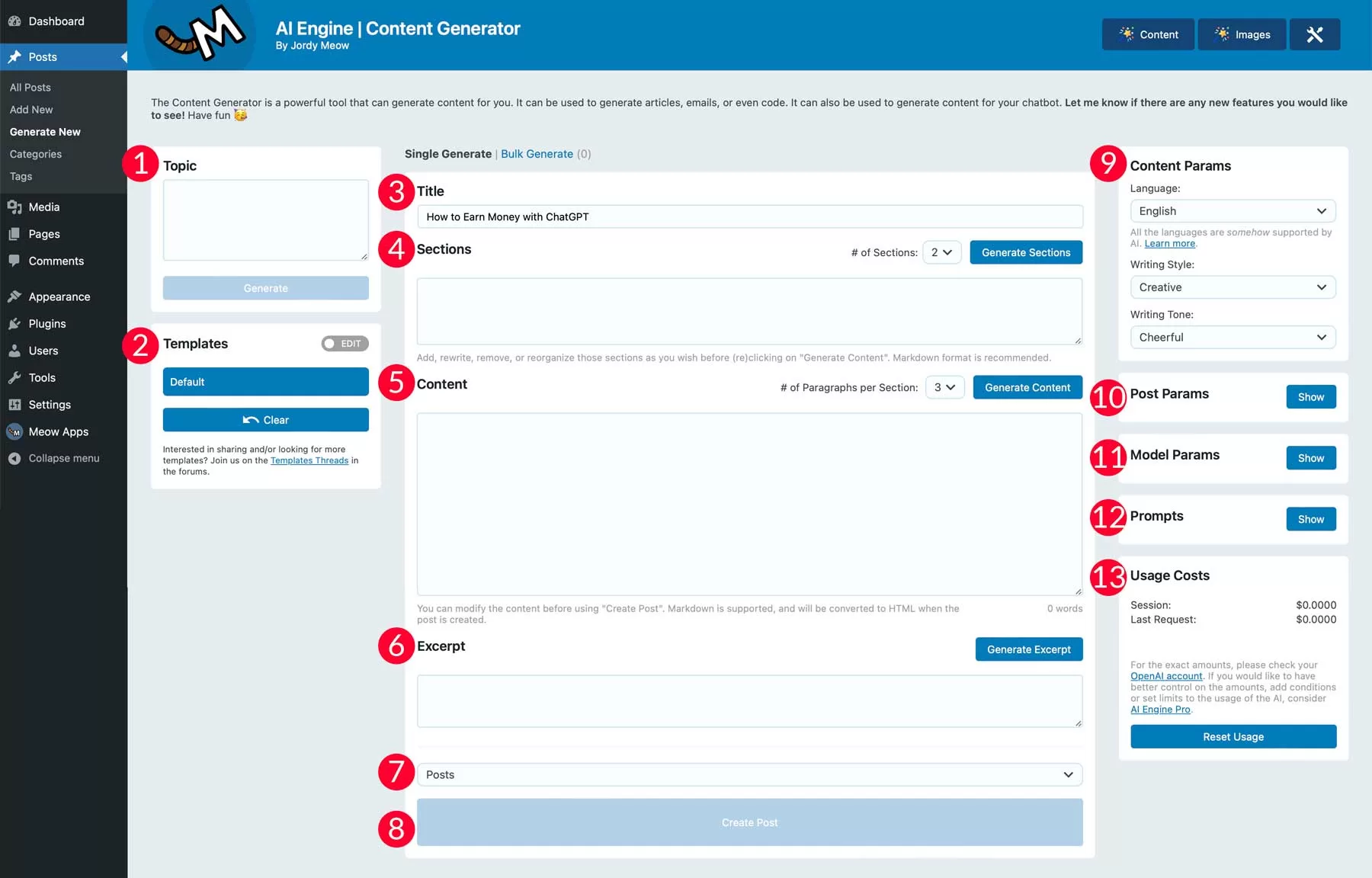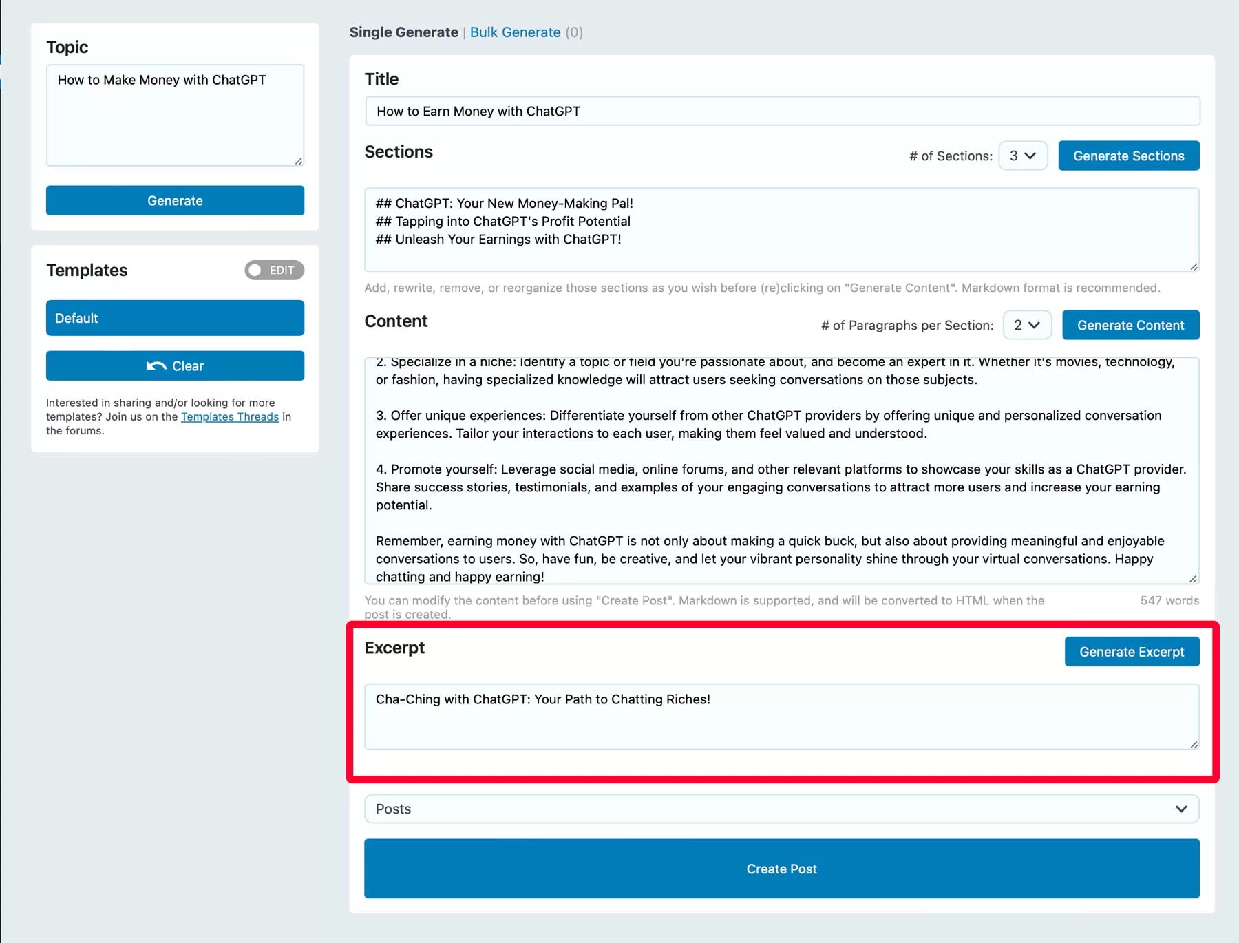现在您已经熟悉了内容生成器中的设置,我们将演示使用 AI Engine 创建博文有多么简单。首先添加以下主题: 如何用 ChatGPT 赚钱。然后点击 Generate 按钮。