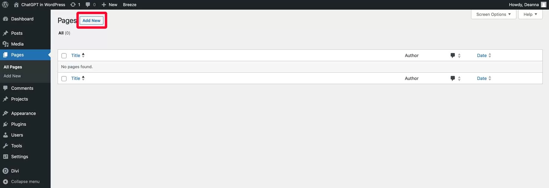 您可以使用 Divi AI 创建帖子或页面,但在这篇文章中,我们将创建一个页面。登录 WordPress 管理仪表板,然后创建一个新页面,开始使用 Divi AI 和 ChatGPT。