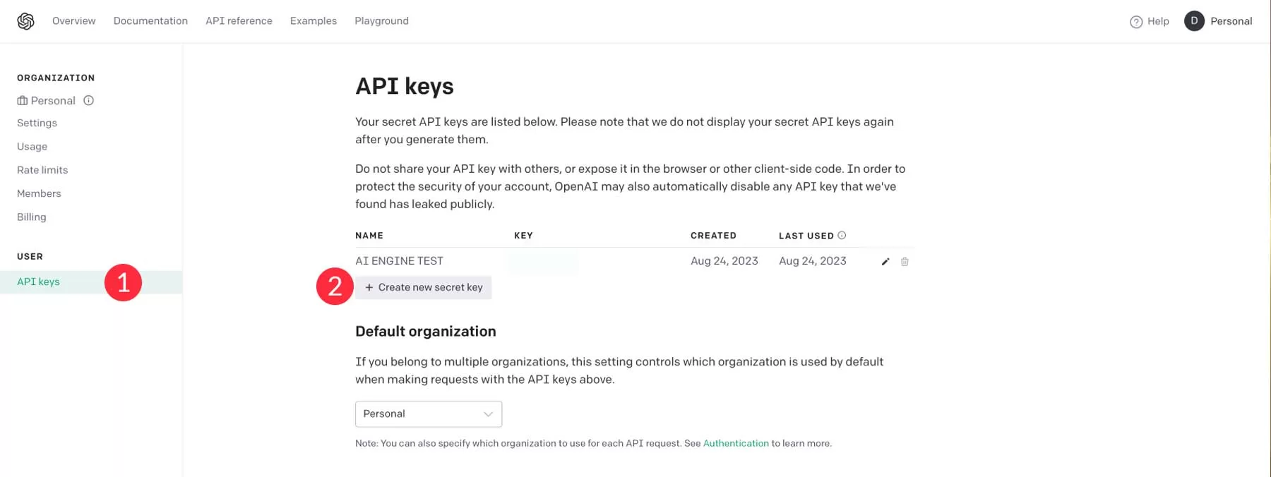 购买点数后,点击 USER 选项卡下的 API keys (1)。点击 + Create new secret key (2)。